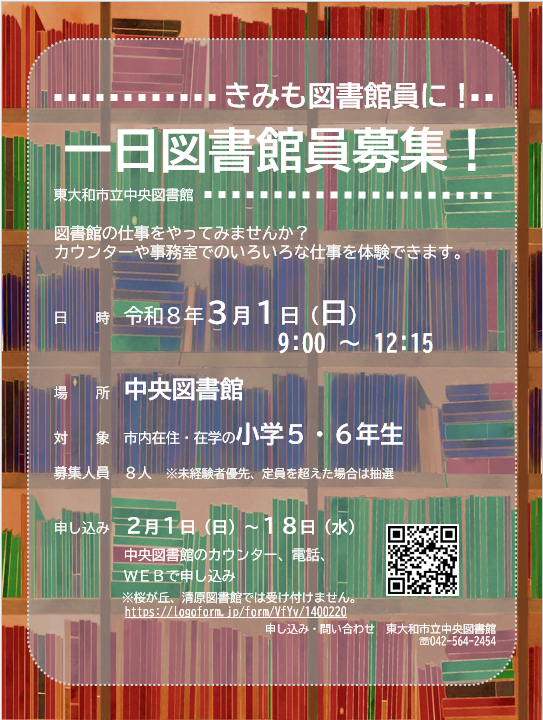 申込み 2月1日(日)~18日(水) 中央図書館のカウンター・電話・図書館ホームページで受付けます。